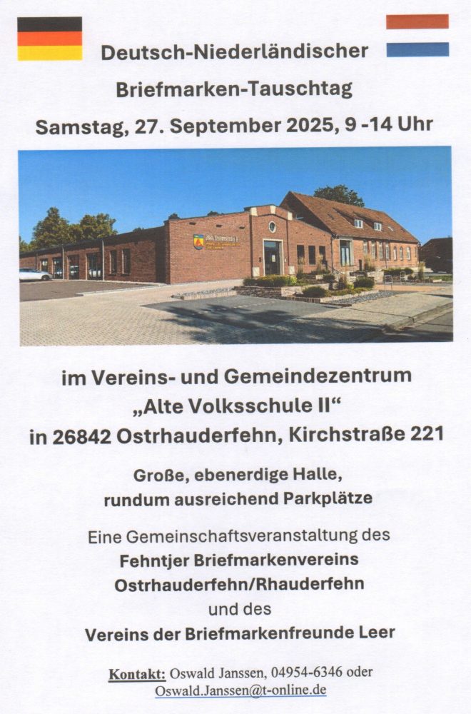 Unser Verein ist beim Stadtjubiläum dabei und zeigt in der Sparkasse Leer in der Mühlenstraße 93 vom 24. Juli bis 11. August alte Ansichtskarten aus Leer, Leeraner Postgeschichte von 1749 bis 1875 und einige Briefmarkensammlungen der Mitglieder.